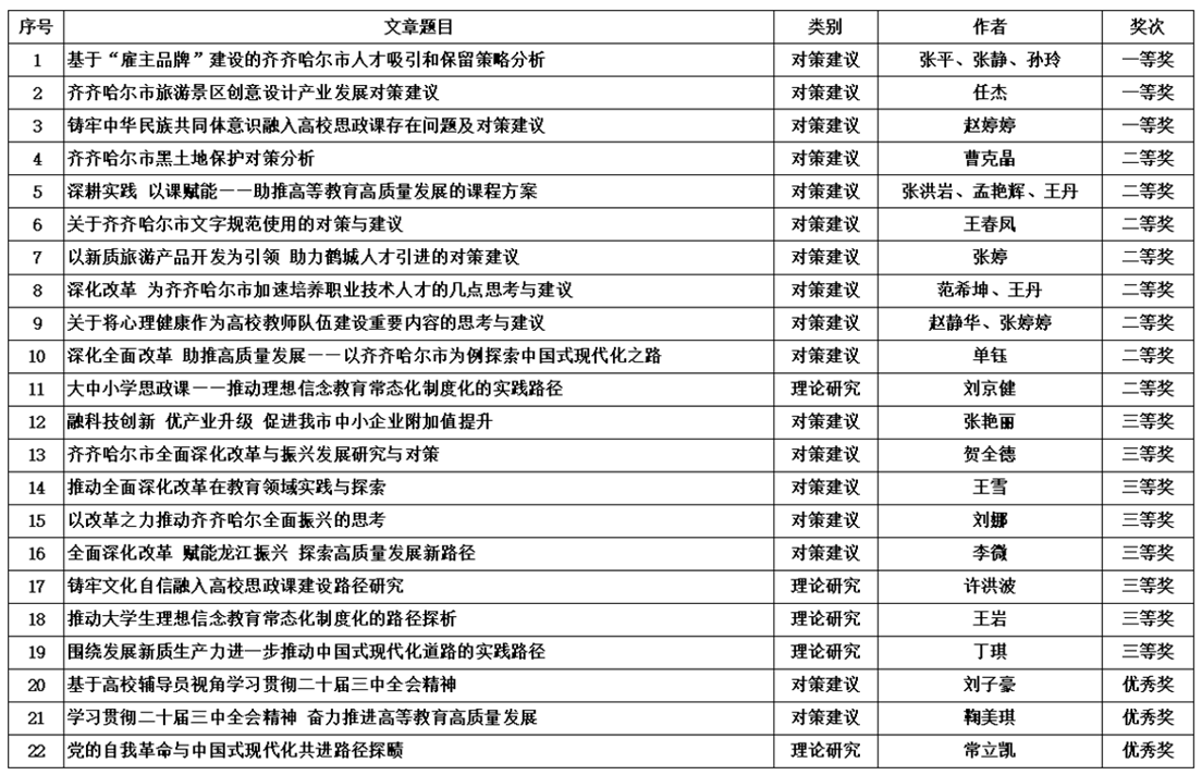 近日,市委宣传部、市社科联下发《关于学习宣传贯彻党的二十届三中全会精神主题征文评选结果的通知》(齐社联通〔2025〕1号),永利推荐申报的22篇征文作品均获奖,其中一等奖3篇,二等奖8篇,三等奖8篇,优秀奖3篇,超过全市获奖征文总数的1/6。