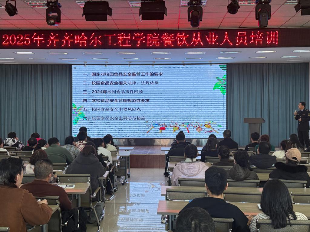 为进一步构建“三全”育人新格局,守护全校师生“舌尖上的安全”,2月28日,总务处组织开展了2025年餐饮从业人员春季培训会。创校校长、理事长曹勇安、齐齐哈尔市市场监督管理局食品科科长刘文武出席培训会并作讲座,总务处、餐饮业主、从业人员142人参加培训。