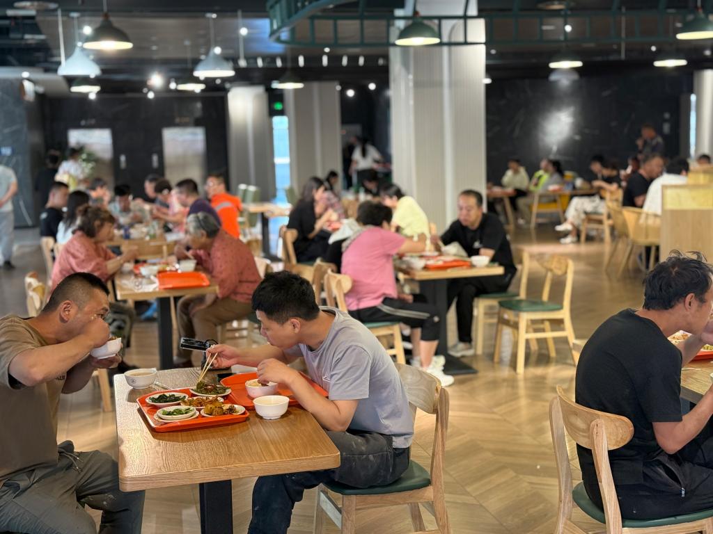 二层设有传统中式餐饮区和超市,在这里可以品尝到经典的中式美食,感受家的味道;三楼则汇聚了20余家特色档口,麻辣烫、铁板饭、烧烤、各种蜀香等别具地方特色的菜品琳琅满目,总有一款能满足大家的味蕾。每日从 6:00 到 21:00,百余人的餐饮服务团队全心投入,为用餐人员精心准备三餐,让食客在任何时间段都能品尝到美味佳肴。