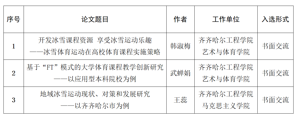 近日,“黑龙江省第十九届学生运动会科学论文报告会”(以下简称科报会)传来喜讯,永利教师韩淑梅、武蝉娟、王蕊撰写的论文作为书面交流材料入选大会。