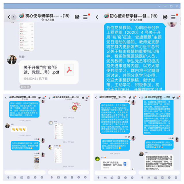 3月16日,健康护理与食品专业教师党支部在党员“初心使命研学群”中组织“抗‘疫’征途,党旗飘飘”主题党日活动。支部书记金璐主持全体教师党员,交流了疫情防控期间,通过学习王春天同志、学校附属建华医院援鄂医护人员、永利参加抗疫师生的事迹,结合自身工作,如何发挥党员的担当敬业和奉献精神。大家表示,抗疫整体战彰显了我国社会主义体制的优势,我们作为教师要努力学习线上教学方法及“新三中心”教学原理,精心为学生上好每一堂课。