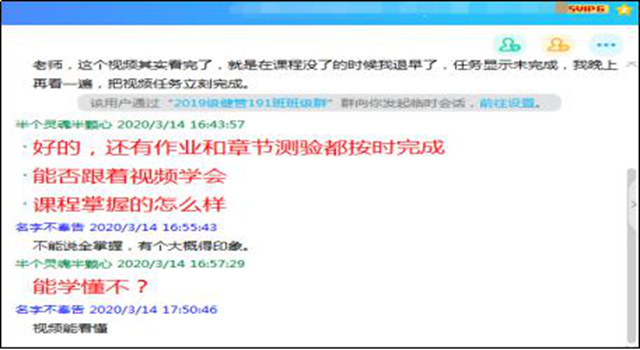 及时关注学生的学习动态——除了固定的答疑时间之外,教师应及时提醒学生任务点的完成时间、考核、作业完成的时间节点,对学生的讨论、作业等及时反馈,阶段性地公布学习情况,对成绩低的学生及时预警。如发现学生对哪个知识点没有掌握,我便会及时线下联系,单独讲解,保证每个学生都不落下: