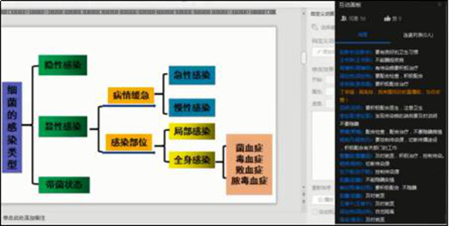 五是课程思政自然融入课程。例如讲到“病原菌侵入机体能否致病,与细菌的毒力、侵入机体的微生物数量、细菌的致病作用与其毒力、侵入机体的微生物数量、侵入途径及机体的免疫状态、环境因素等密切相关”时,通过讲病原体侵入机体能否引起感染还取决于“机体的免疫力的高低”引出课程思政。通过让学生思考“免疫力的高低与什么有关系”,引出对健康的生活方式的倡导。