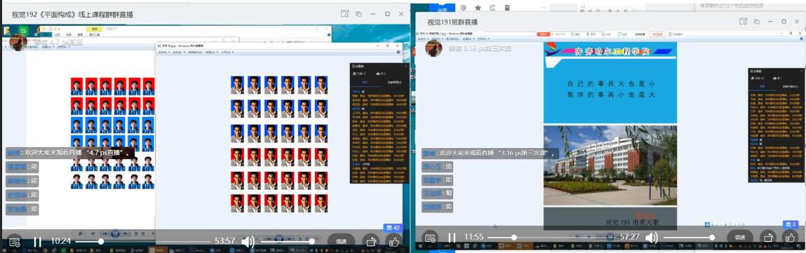 教师点评——蕴含课程思政,润物细无声。直播的最后一个时段,教师总结性地讲,对难点进行点拨,传授快捷的操作技巧,让学生产生终于获得了解决办法的“满足感”。同时,鉴于软件的功能特点,着重强调职业操守,不能什么都来“PS”。课程设计的四份项目作业(即学习载体),分别从关注自我形象(外在与内在并重)、热爱校园、关注学校历史、关注社会公益活动方面融入公民美德教育,融入课程思政元素。