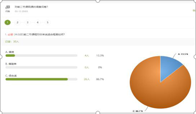 (三)学习状态掌握情况。为更好地了解学生对课程知识的掌握情况,在课后对学生易错题测试结果、作业的共性问题进行汇总,对学生作业、测试不合格的打回重做。同时将学生上节课的思维导图生成二维码,设计课堂投票、问卷内容,每两节课给学生发一次网络课程改进调查问卷。