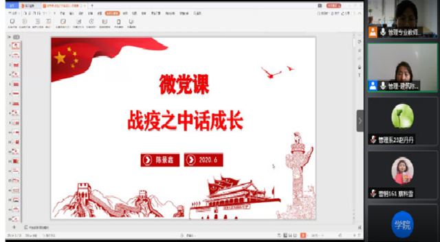 不久前,为贯彻落实学校《在常态化疫情防控中加强高校基层党建“四个一”行动方案》,陈书记以《战疫之中话成长》为题为全系教师党员、学生党员上了一次党课。她从以人民为中心、党中央坚强领导、全国一盘棋、管理工程系党员教工积极抗疫做表率四个方面展开讲解,并结合系里实际,引导大家勇于创新,坚定信念,在疫情阻击战中体现党员的使命与担当。与会党员纷纷表示,在党课学习后受益匪浅、深受启发。