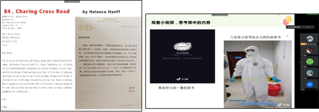 (三)丰富课程设计,融入思政元素,提高学习兴趣。随着网络授课时间的延续,部分学生逐渐失去了最初上网课的新鲜感和兴趣。为减少学生疲劳或者厌学的情况,就在课上尽量多地设计一些有趣的活动环节,调动学生的学习积极性。例在讲授英文私人信件的写作技巧时,同时将书信体小说《查令十字街84号》、红色家书和抗疫家书引入课堂,分别以文本和小视频的形式展现给学生,播放后让学生表达自己的感受。教师在总结的过程中,自然而然地把热爱祖国和乐于奉献的思政元素融入其中,不仅使学生从视、听、说的角度感受所学内容,调动了更多感官,还提高了学习兴趣。