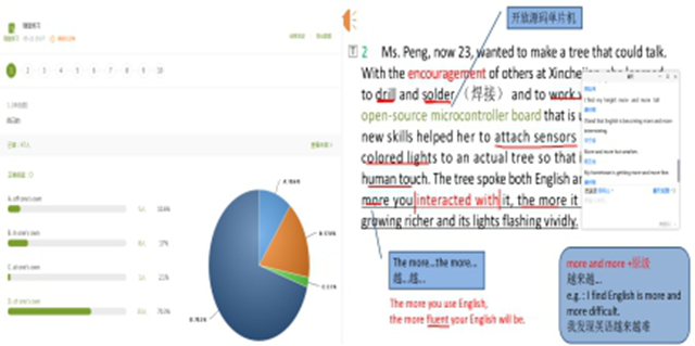 (二)小步伐、高频率、快反馈,强化学习效果。在授课过程中,本着“小步伐,高频率,快反馈”的原则,讲完一个语言点后及时进行检测。第一种方式是通过学习通的“随堂测验”功能,把需要检测的语言点提前录入,并设置学生答题时间,课堂讲解完以后开启测试。测试结束后,教师可以通过学习通的统计,直观地了解到学生的掌握情况。第二种方式是教师提问,学生先把自己的答案以文字的形式发布在腾讯会议的聊天区,教师再从这些同学中,随机选出一名或两名同学开麦讲解自己的答案。这样,一方面可以掌握大多数学生的听课情况和对之前所讲解内容的掌握情况,促使学生及时强化所学语言点;另一方面也可以避免学生复制粘贴其他同学的答案,使所有同学在上课的过程中都集中注意力。