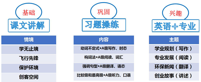 通过课程情境的设计,将教材原有的教学单元进行整合,每个情境对应不同的学习内容、“英语+专业”主题和思政元素。授课过程分为课文讲解、习题操练和“英语+专业”活动。课文讲解阶段,教师在学生课前预习的基础上,对课文内容进行详细分析,并对其中涉及到的重难点内容进行细致讲解,包括单词、句型、语法等,因为这部分内容是整个情境的基础环节。习题操练阶段,针对本单元的重难点内容组织练习,同时给学生讲解A级考试相关题型的解题技巧,对知识点进行巩固和加强。“英语+专业”活动,是在完成前两个环节的基础上,使每个情境的主题和学生的专业内容相结合,对所学知识进行应用,同时也让学生感到学以致用的乐趣,激发英语学习兴趣。每一个授课环节,都适时融入课程思政元素。