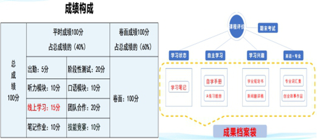 本学期的课程评价,依然是由平时成绩和期末卷面成绩两部分组成。与之前比做出改进的是,在平时成绩中增加了线上学习的分数(占平时成绩的15%),主要是指学生在学习通的积分情况;听力模块和口语模块的分数,分别由学生的听力老师和口语老师给出;平时成绩的其他组成部分,即出勤、阶段性测试、团队合作、笔记作业和技能竞赛,均分为线上和线下两部分,具体得分需视情况而定。最终,会形成成果档案袋。