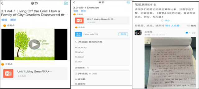(一)任务前置,引导自学,提高学习效率。提前在学习通平台发布下次课上所要学习的内容,包括预习PPT、单元学案等,并在“章节”中设置“任务点”,要求学生在上课之前完成任务点即预习工作,并把手写的预习笔记拍照发布在学习通平台的主题讨论区中。通过组织课前预习,使学生提前了解下次课上的授课内容,以便在线上听课的过程中有所侧重,对不懂的问题可联系老师解决。