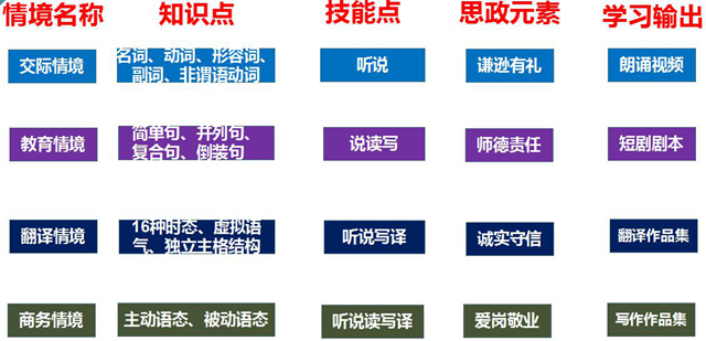 (一)根据专业培养目标,设置教学情境。因为英语语法知识很丰富,任何一本语法教材都可以当做一本工具书来查阅,所以教师将学生最易于理解和接受的《张道真实用英语语法》这本教材重构为词法、句法、时态和语态四部分,帮助学生理顺英语语法基本体系。同时,根据英语专业人才培养方案中的培养目标,设置教学情境和与教学情境相对应的知识点、技能点、思政元素和学习输出等内容。
