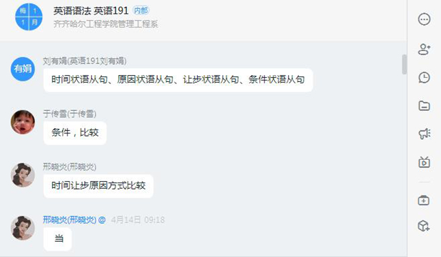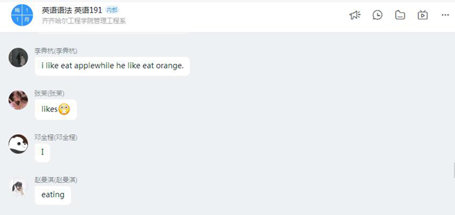 在线教学以来,我通过钉钉、学习通、QQ群信息化平台为英语191班学生讲授学科基础课《英语语法》,鼓励学生做英语有心人,在课程学习中敢想敢发声。