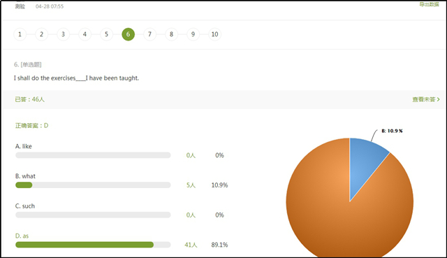 针对学生在测试中的错误,教师先解析错题,然后将测试成绩导出,并要求测试成绩不及格的同学利用错题中的知识点造句,同时以学习通私信等方式给教师讲解该知识点或者提问,以便学生能够真正会运用该知识点。