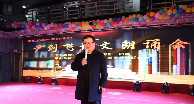 11月10日18点,由学校党委宣传部与团委主办,校园调频台、大学生社团联合会承办协办的庆祝建校30周年系列活动之一“尹剑飞诗文朗诵会”在学生活动中心隆重举行。