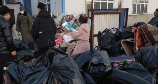 11月10日,机电团总支书记李丽莎老师和青工部部长陈东旭、徐振辉等在五公寓废品回收站点清理垃圾,送往校外垃圾站进行变卖回收。