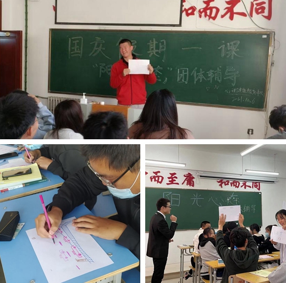 10月5日至6日,为上好“国庆假期一课”,学生发展中心教师付东双,大学生心理发展协会干部22人组成心理健康辅导团,利用早自习时间对2021级学生开展“阳光心态”心理健康团体辅导。心理健康辅导团首先以击鼓传花、大风吹等游戏带动学生积极参与,活跃气氛。随后学生进行画画接力,每名同学在画纸上画上喜欢内容,依次传递,学生在感受画面变化过程的同时增强了团队合作意识。最后心理健康辅导团为学生发放心理健康知识宣传卡,希望学生遇到心理困惑,可通过卡上的预约渠道进行心理咨询。活动结束后,同学们纷纷表示通过 “阳光心态”团体辅导活动,缓解了假期思家的情绪,国庆假期过得很愉快。