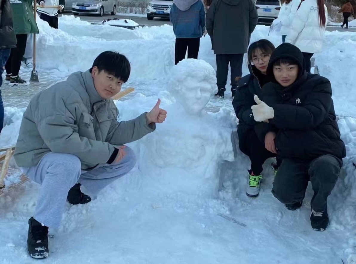 在专业老师的启发下,同学们热情满满地投身到雪雕制作中,经过几个小时的努力,在同学们齐心协力下,共同完成了多组雪雕作品,有为彰显学校“亮剑”精神的坦克大炮,有憨态可掬、造型可爱的卡通人物,有立体的艺术人像等。