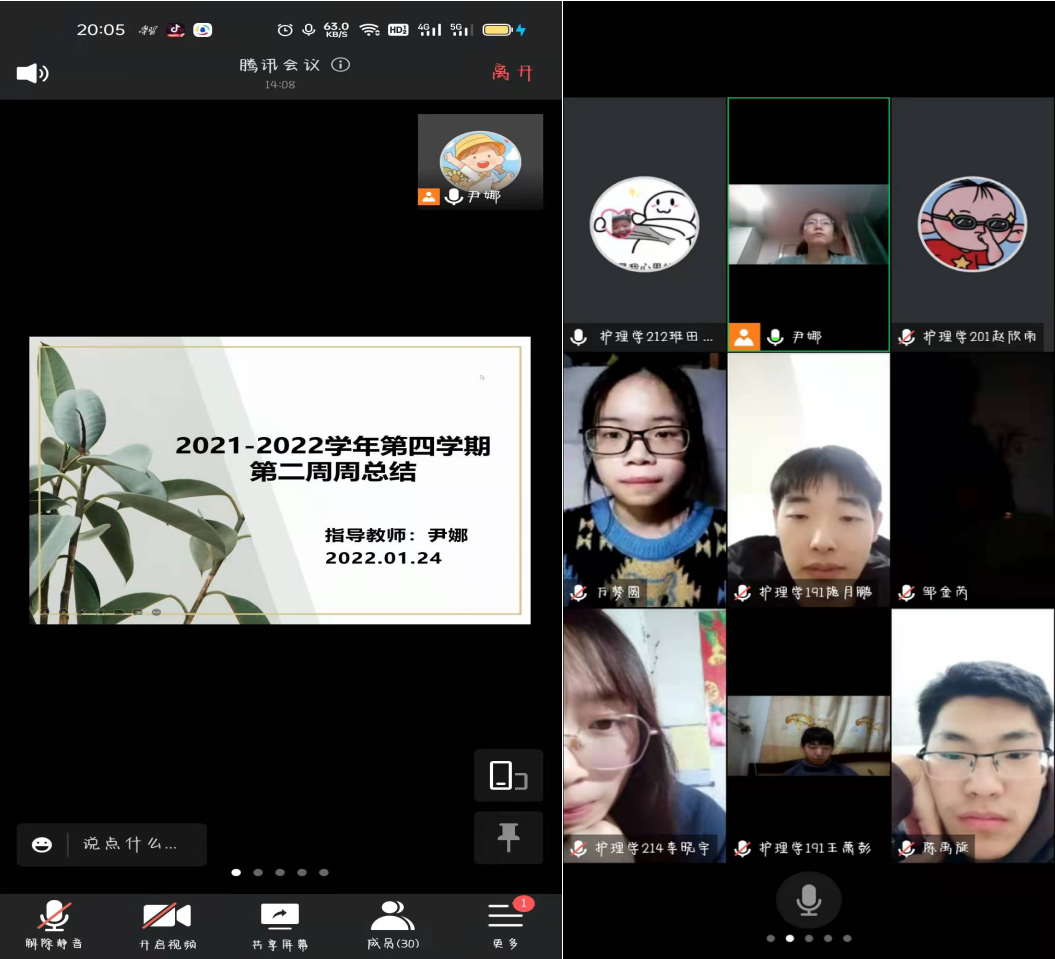 1月24日晚健康与护理系生涯导师尹娜采用腾讯会议召开第四学期第二周总结会议,会议由尹娜老师主持,健康与护理系113组—120组成员共同参加。