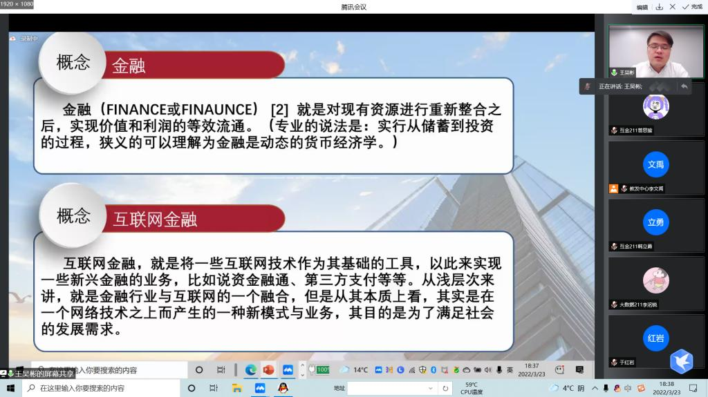 王吴彬曾就职于中国人民银行溧阳市支行,现供职于江苏省国际信托有限责任公司,长期从事家族财富管理、家族信托、保险金信托研究与管理工作。本次讲座,王老师首先分析了金融与互联网金融二者的概念;随后,从国际形势、蚂蚁花呗等方面对互联网金融行业的业态进行分析和讲解;最后,通过引入阿里巴巴的相关视频,让同学们清晰地了解和认识互联网金融。