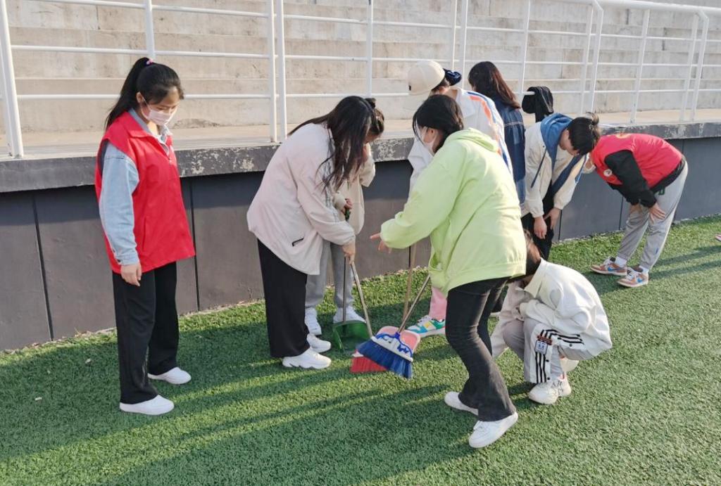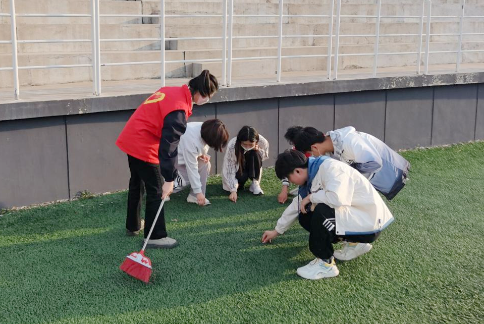 在校学生会体育部部长王旭带领下,校学生会成员在体育场内捡拾垃圾,并对绿化带全面清理,不留任何卫生死角。