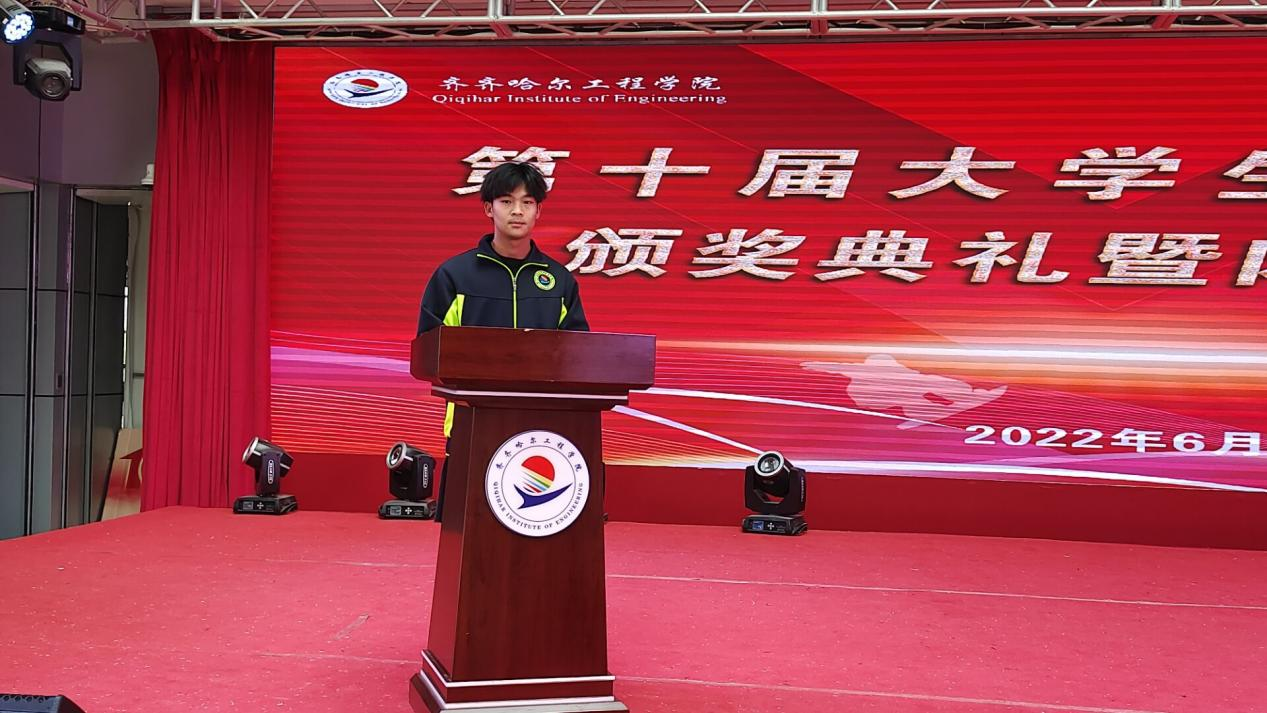 机电工程系电气213班陈宣宏同学代表优秀运动员上台发言。他表示,自己在体育节活动中,各方面都得了锻炼,在今后的学习生活中,会更加积极地迎接新的挑战。
