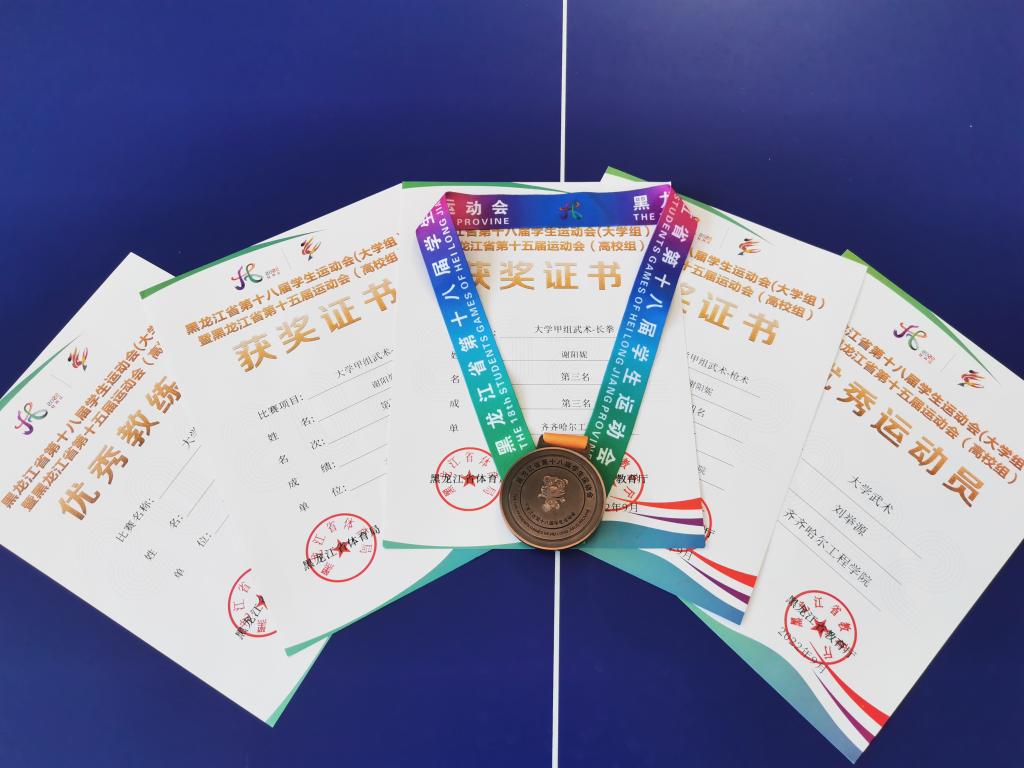 永利武术队的谢阳妮同学获得女子长拳铜牌、女子剑术第四名和女子枪术第四名的好成绩;乒乓球队的刘宇婷、武术队的刘举源同学荣获优秀运动员称号;两个项目的教练员韩淑梅和于壮老师均获优秀教练员称号。