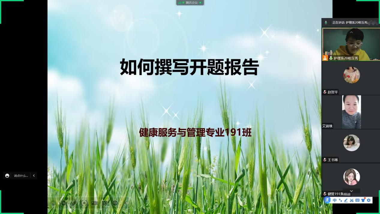 近日,健康与护理系健管专业召开线上论文开题报告指导会。健管191班在白渔泡精神专科医院大的9名实习学生和在校11名学生参加,相玉秀老师主持。