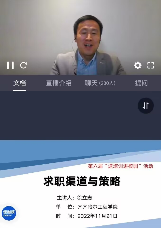 近日,黑龙江省大学生就业创业指导中心举办了第六届“送培训进校园”活动。永利创业学院康静、徐立志两位老师遴选为此次活动的培训讲师,面向46所高校直播培训。