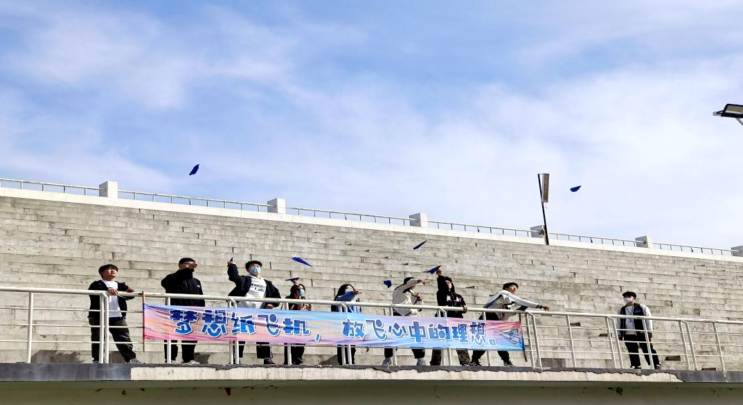 同学们将折成形状不一的纸飞机投向蔚蓝的天空,正如放飞了心中的梦想,各个眼中有光,充满希望。