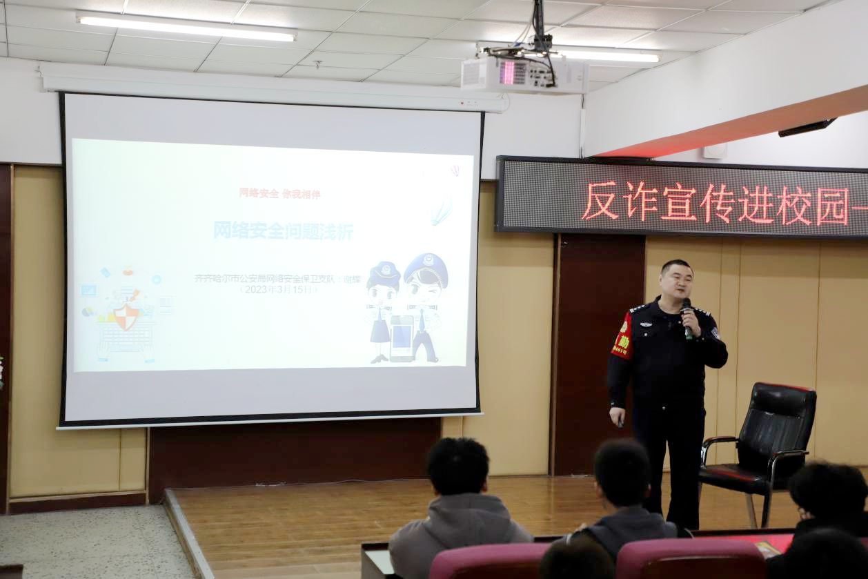 4月12日下午,校团委在图书馆501报告厅开展“反诈宣传进校园——网络安全·你我相伴”主题讲座,特邀请市公安局网络安全保卫支队教导员谢辉主讲。300名学生参加。