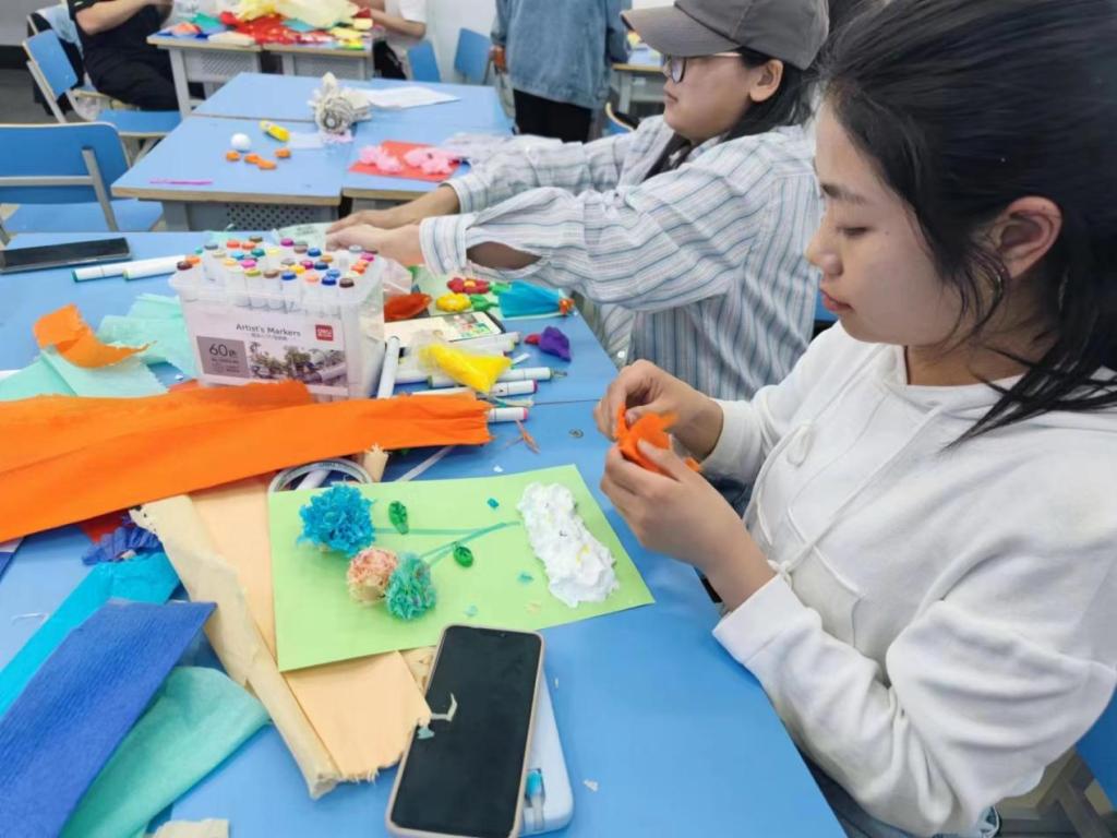 工作人员为学生提供了卡纸、皱纹纸、黏土等材料。学生在卡纸上自由发挥,用材料所做出的图形、花朵与文字去表达对母亲的爱。活动现场大家认真创作,同时互相交流,分享自己的创意与想法,气氛温馨和谐。