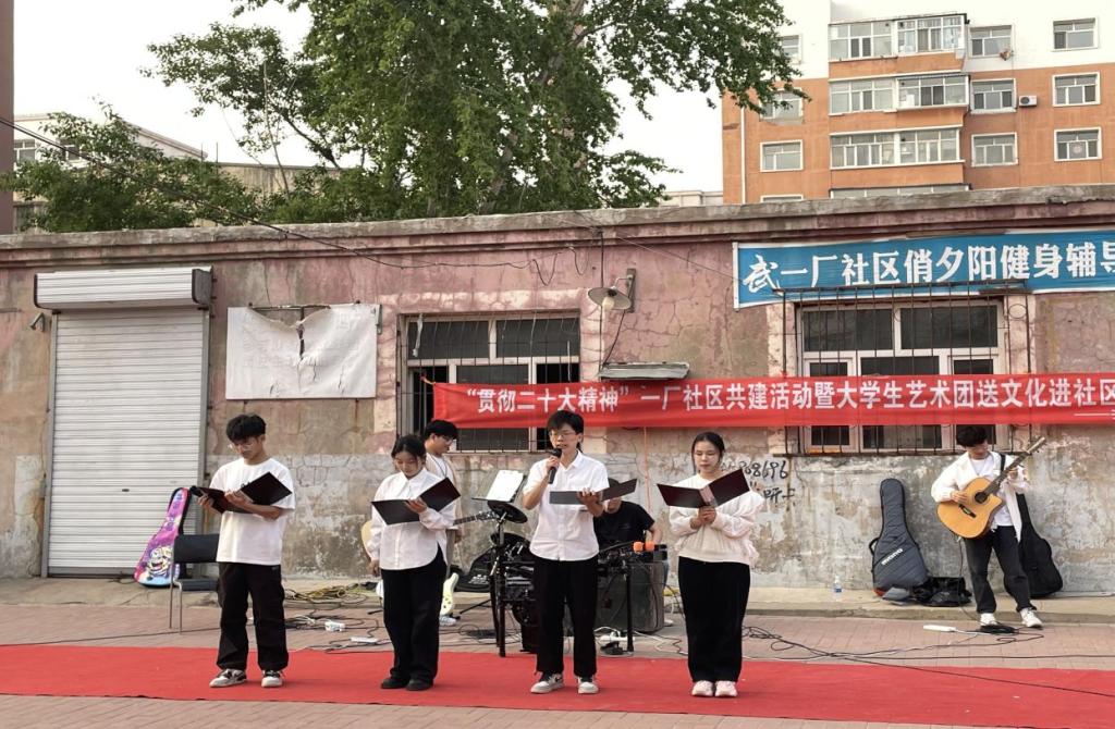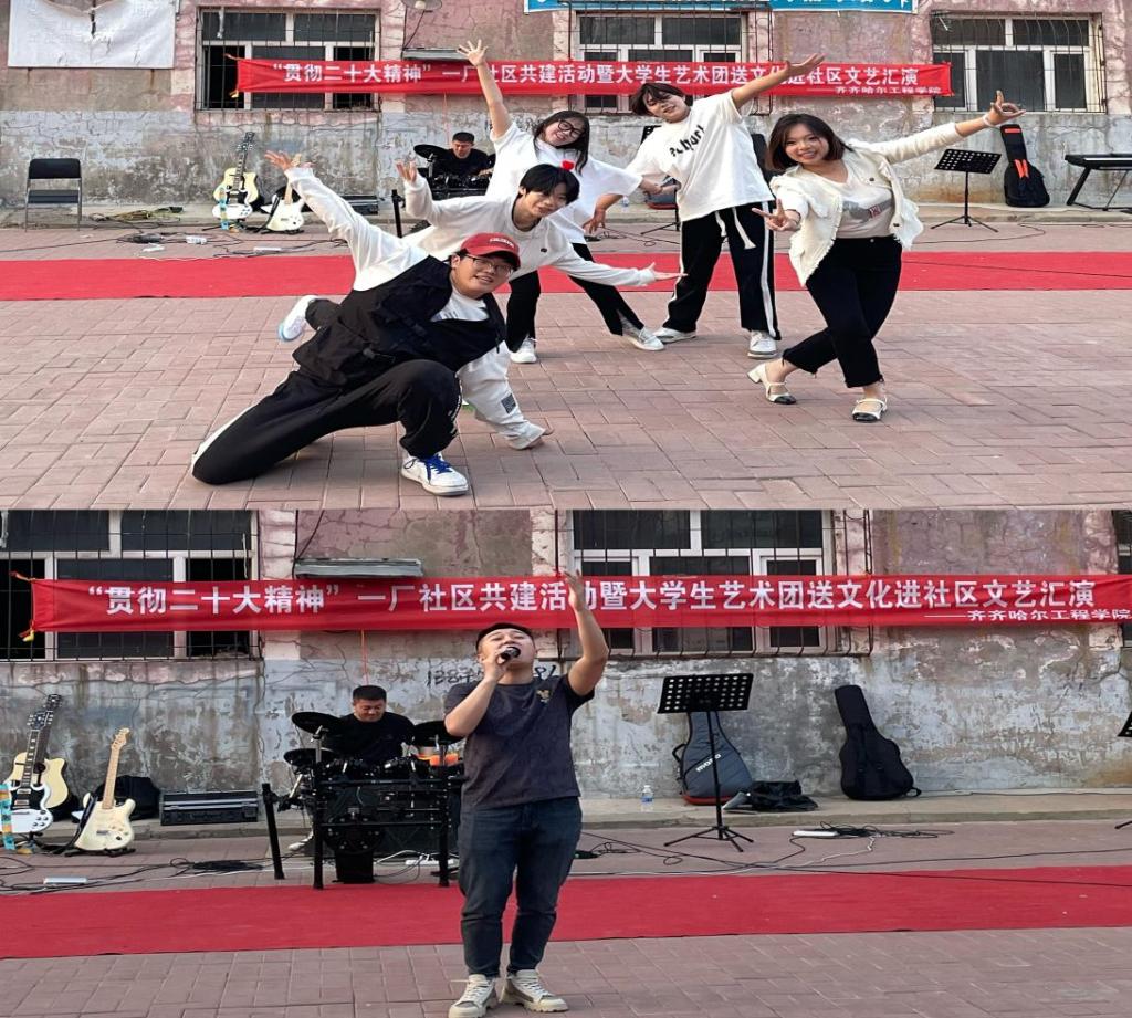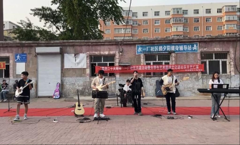 5月18日晚,由学校基础部美育教研室主办的“贯彻二十大精神”一厂社区共建活动暨大学生艺术团送文化进社区文艺汇演在一厂社区举行,旨在加强区校之间文化交流,更好地推动大学生文艺服务社区。40名文艺志愿者来到龙沙区一厂社区,为居民呈现了一场精彩的文艺演出。