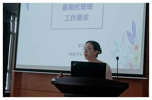 姜岩强调,今年是学校举办教职工免费托管班的第三年,7月3日开始,托管班的孩子每天来学校进行德、智、体、美、劳诸方面的学习,他们的安全是学校最为关注的事情,校园内有易湖,有往来的车辆和教室里各种用电设备,未知或未可预见的安全隐患很多,安全责任无小事,安全责任重于泰山;教职工一定要履行自己第一监护人的职责,嘱咐教育好自己的孩子,让他们遵守纪律,杜绝一切安全方面的问题。