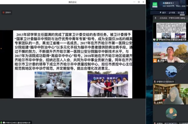 7月21日晚,为学习先进典型,更好地践行专业实践学期实习,健康与护理系仲泰医院实习组在线召开“学习先进典型 汲取榜样力量”典型医务人员思政案例汇报大赛。指导教师及全体实习学生参加,专业教师尹娜、基础部大学语文教师王春凤担任本次比赛评委,护理学224班刘金迪主持。