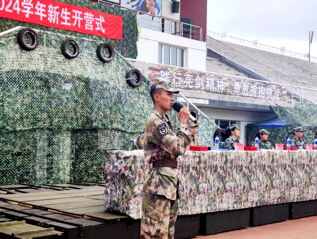 学长教官团政委吴俊楠代表全体教官发言,希望同学们不怕吃苦、勇于面对困难,在接下来的军事训练当中磨炼自己的意志;同时,也表达了全体参训教官的决心和信心。