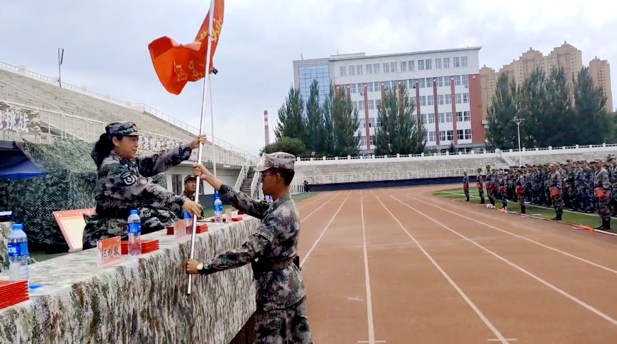 学生工作处负责人王丽萍为教官团团长孙志屹授团旗。