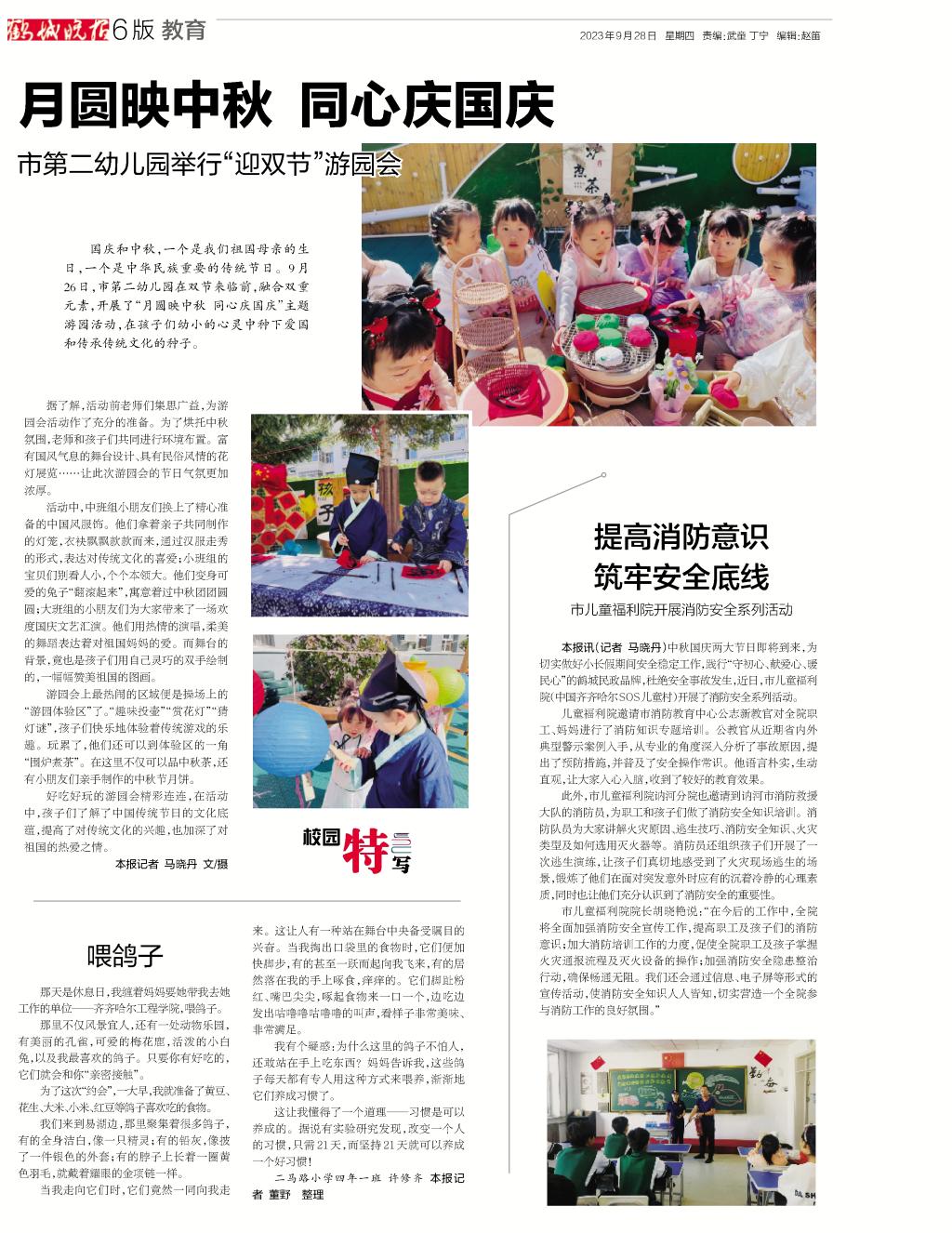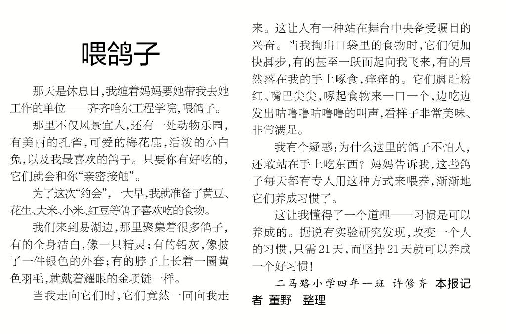 鹤城晚报发表子弟学校学生作文《喂鸽子》