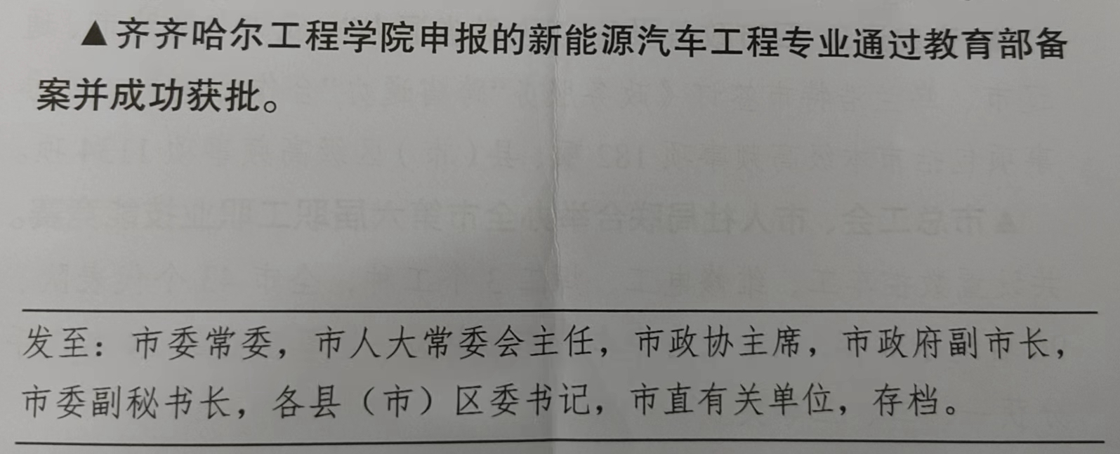 齐齐哈尔信息(2023第20期)发布永利新能源汽车工程专业通过教育部备案并成功获批信息