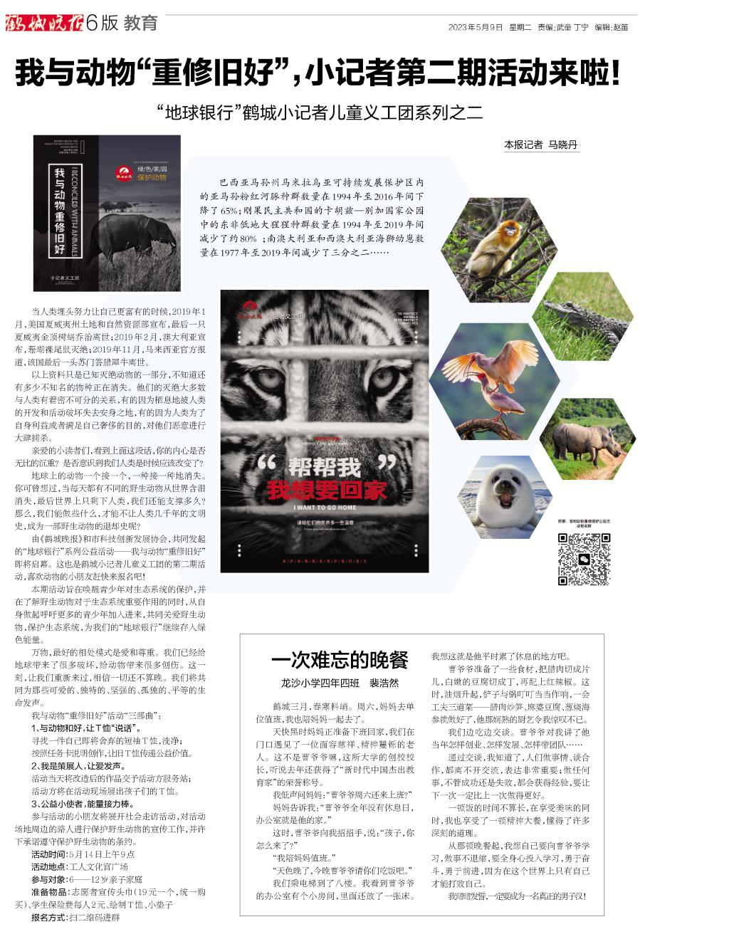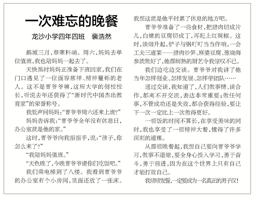 鹤城晚报发表子弟学校学生作文《一次难忘的晚餐》