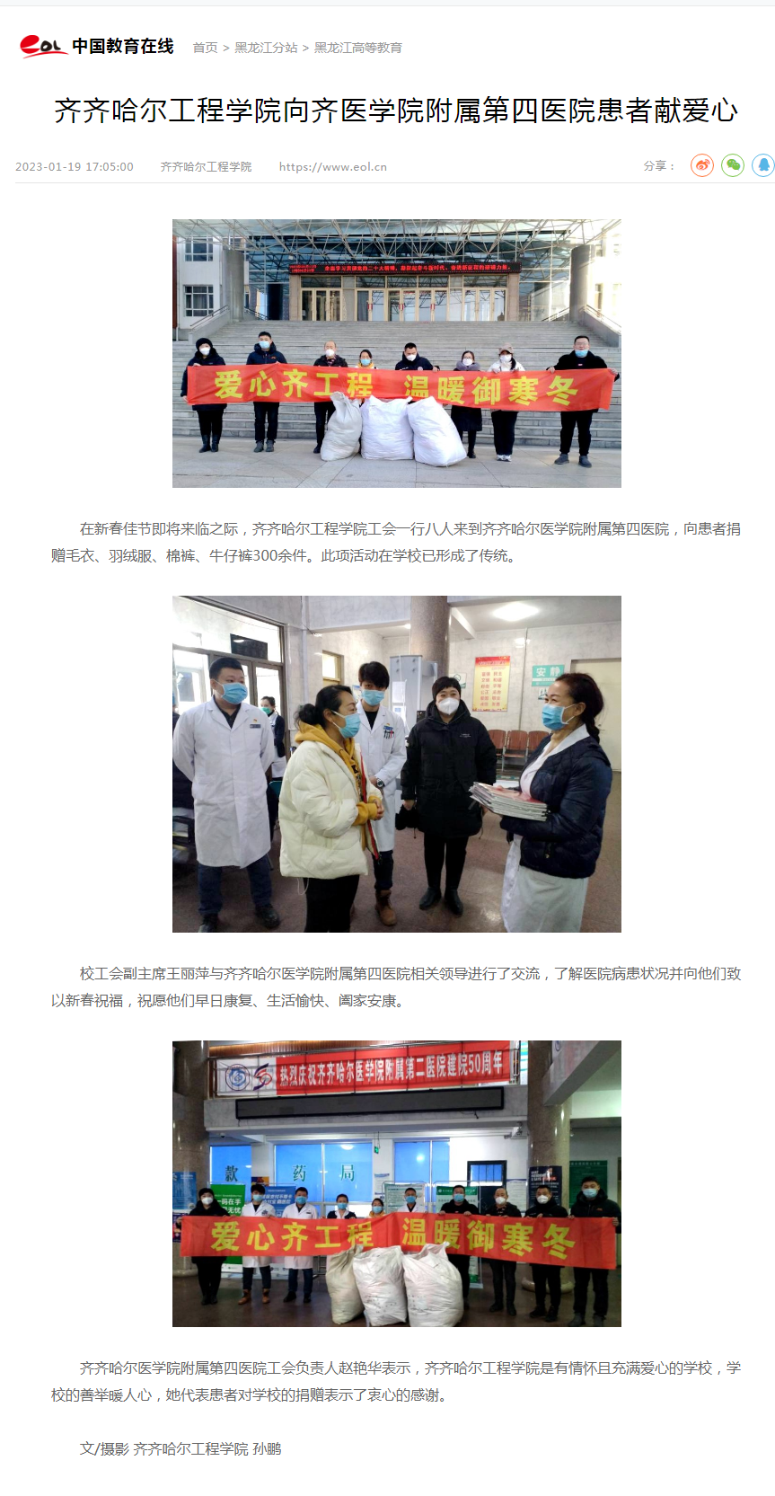 中国教育在线:永利23411集团官网向齐医学院附属第四医院患者献爱心