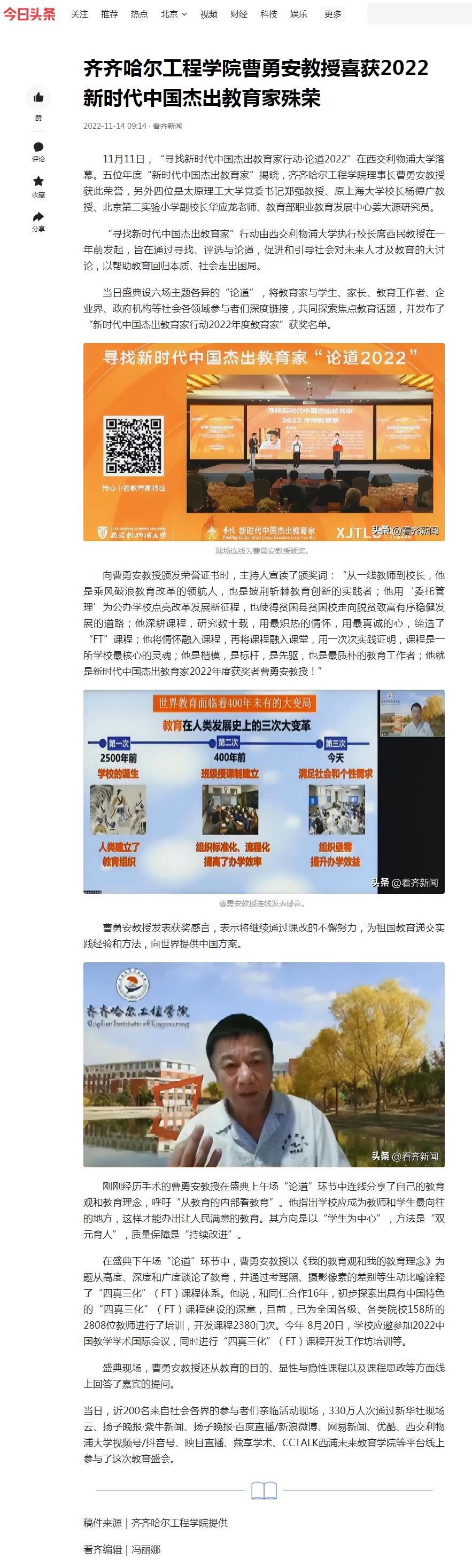 今日头条·看齐新闻:永利23411集团官网曹勇安教授喜获“2022新时代中国杰出教育家”殊荣