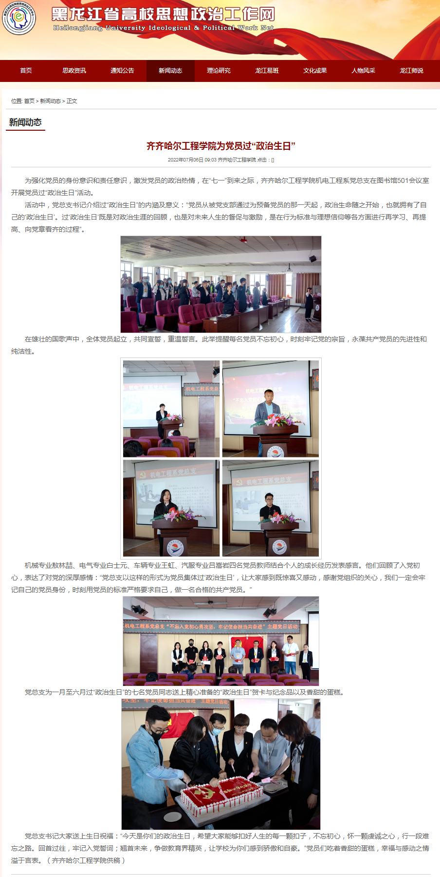 黑龙江省高校思想政治工作网:永利23411集团官网为党员过“政治生日”