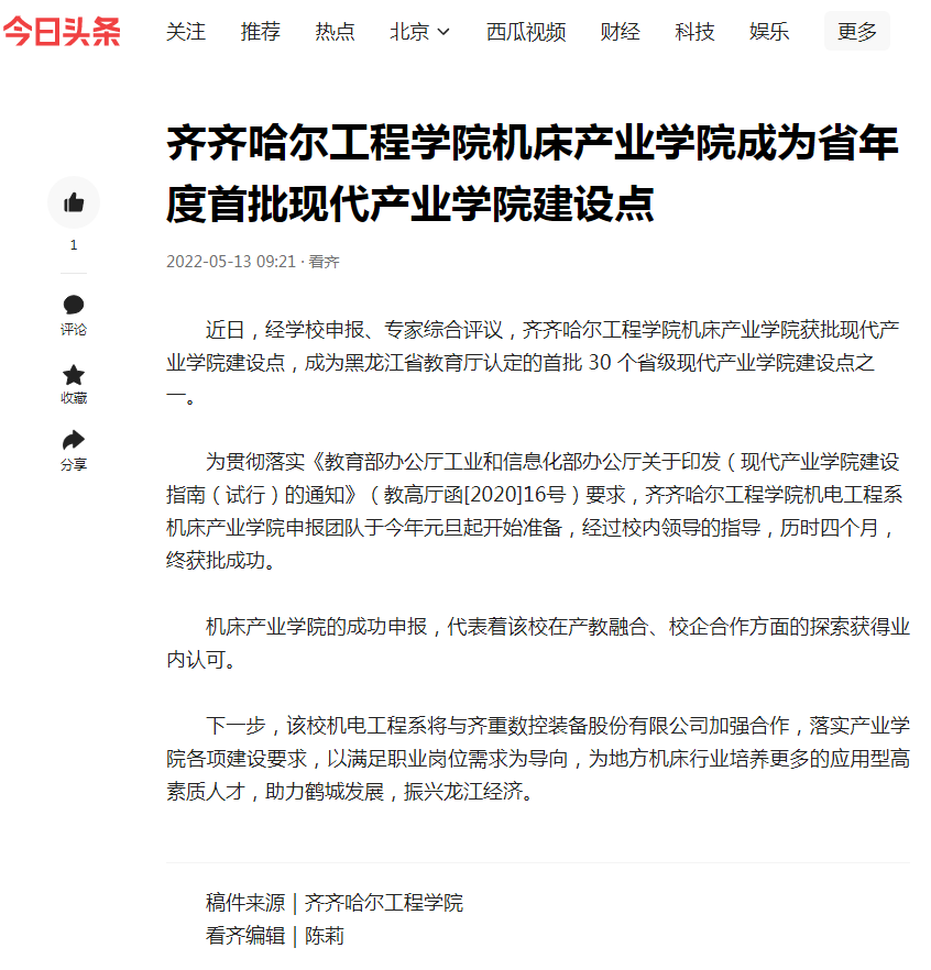 今日头条:永利23411集团官网机床产业学院成为省‬年度首批现代产业学院建设点