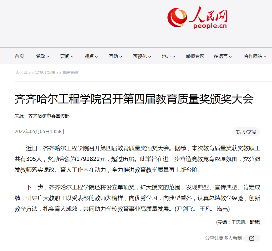 人民网:永利23411集团官网召开第四届教育质量奖颁奖大会