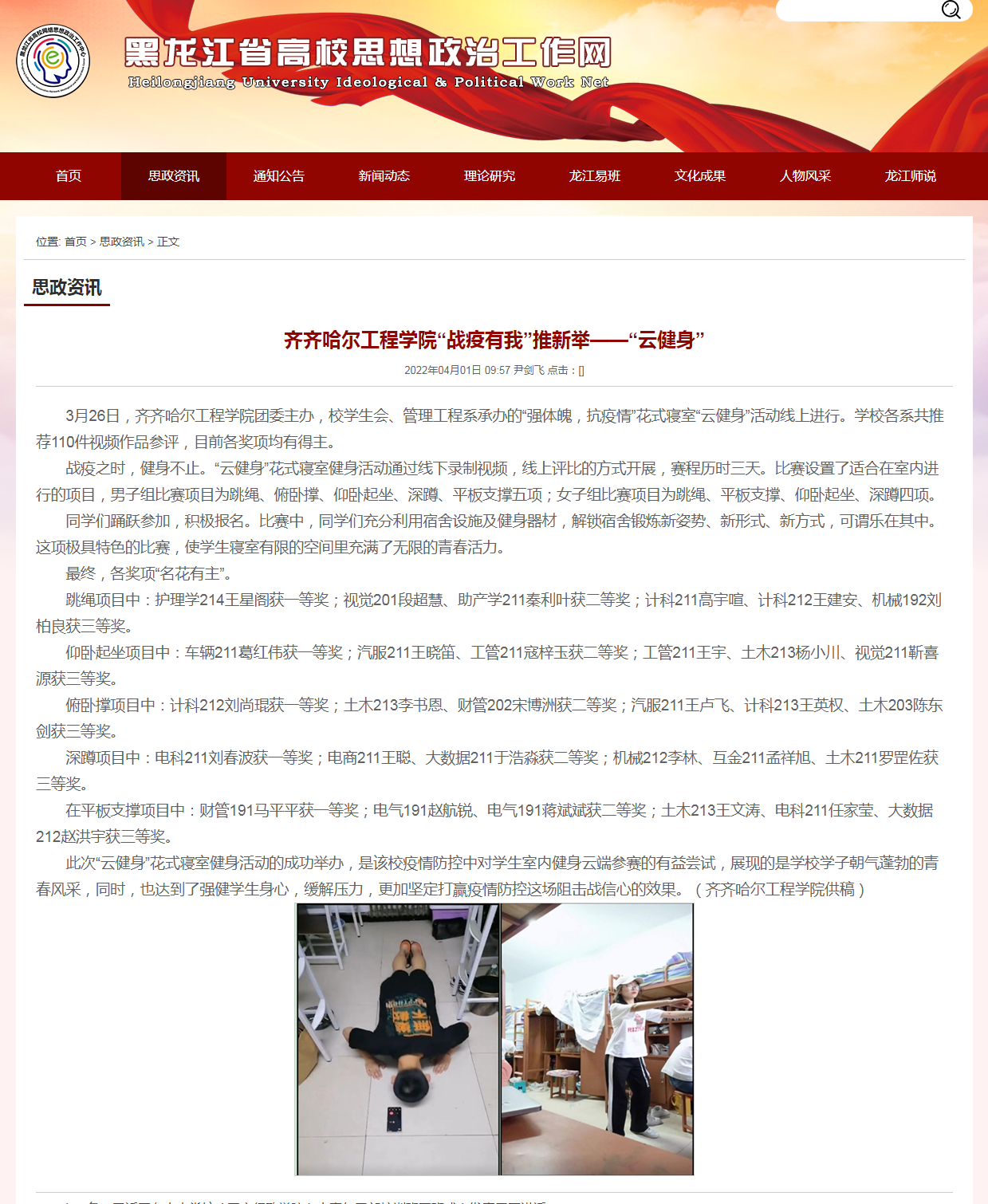 黑龙江省高校思想政治工作网:永利23411集团官网“战疫有我”推新举——“云健身”
