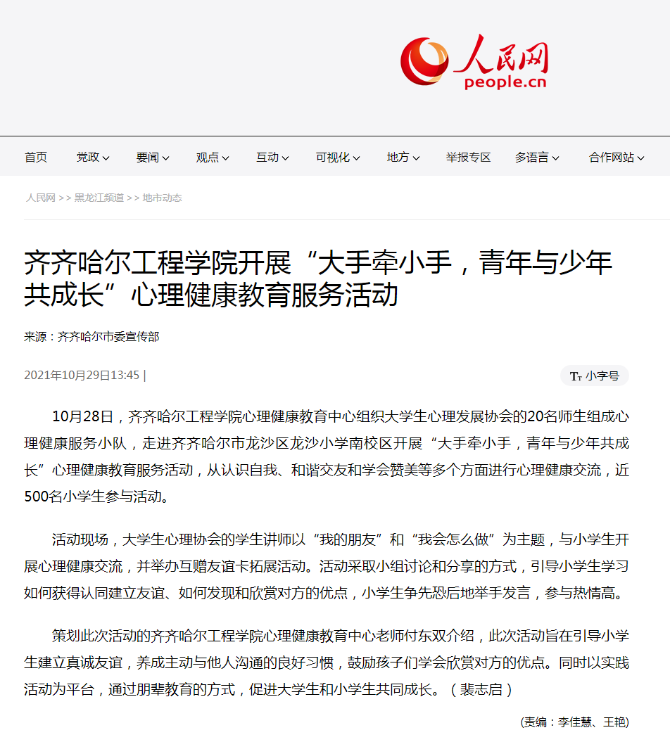 人民网:永利23411集团官网开展“大手牵小手,青年与少年共成长”心理健康教育服务活动