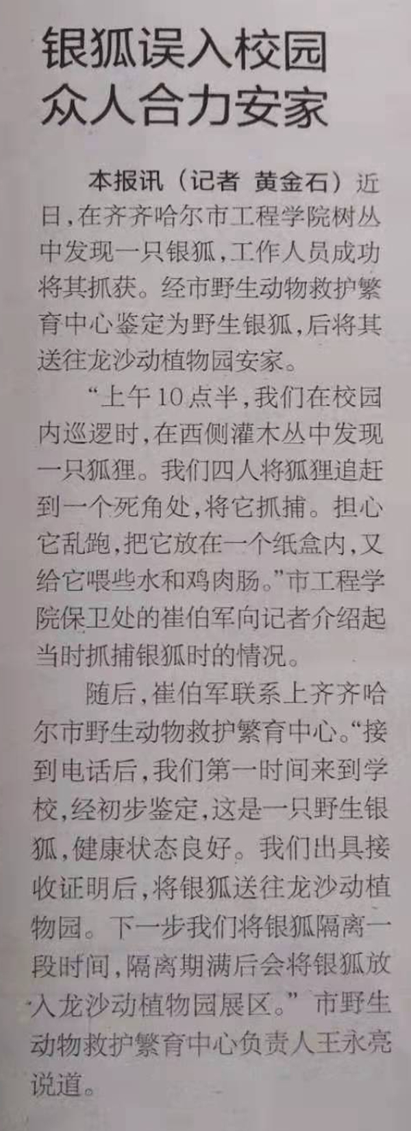 鹤城晚报:银狐误入校园 众人合力安家