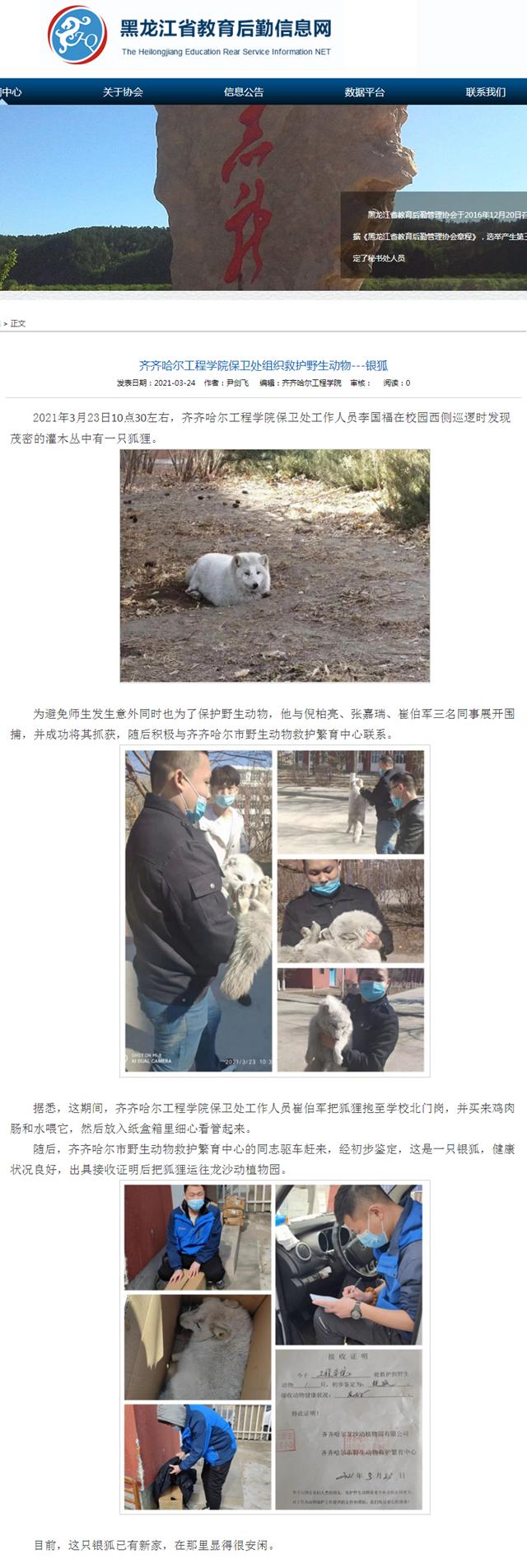 黑龙江省教育后勤信息网:永利23411集团官网保卫处组织救护野生动物---银狐