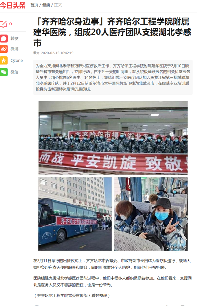 今日头条《齐齐哈尔身边事》:永利23411集团官网附属建华医院,组成20人医疗团队支援湖北孝感市
